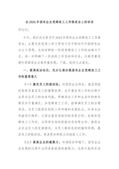 / 【七哥公文】2024年:在2024年国有企业党建政工工作推进会上的讲话+更多免费公文+VX:QiGeGongWen2024