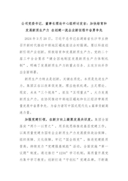 【七哥公文】2024年:公司党委书记、董事长理论中心组研讨发言:加快培育和发展新质生产力 在创建一流企业新征程中奋勇争先+更多免费公文+VX:QiGeGongWen2024