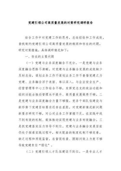 【七哥公文】2024年:党建引领公司高质量发展的对策研究调研报告+更多免费公文+VX:QiGeGongWen2024