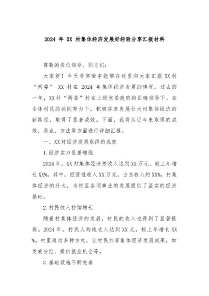 【七哥公文】2024年:2024 年 XX 村集体经济发展好经验分享汇报材料+更多免费公文+VX:QiGeGongWen2024