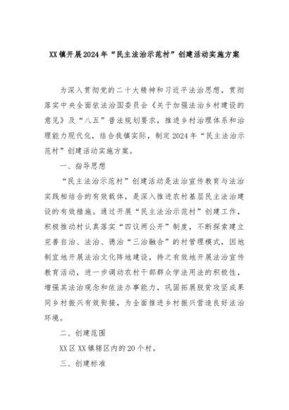 【七哥公文】2024年:XX镇开展2024年“民主法治示范村”创建活动实施方案+更多免费公文+VX:QiGeGongWen2024