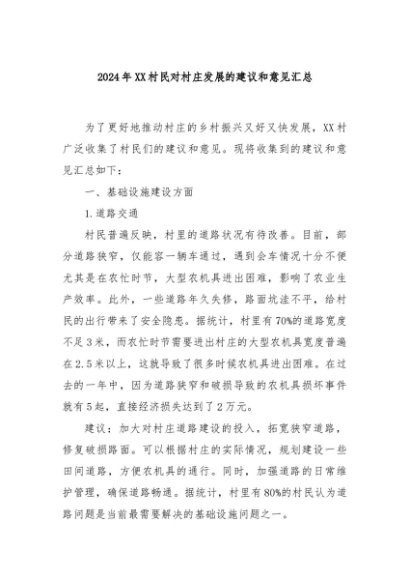 【七哥公文】2024年:2024 年 XX 村民对村庄发展的建议和意见汇总+更多免费公文+VX:QiGeGongWen2024