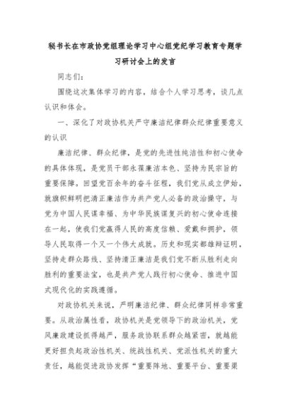 【七哥公文】2024年:秘书长在市政协党组理论学习中心组党纪学习教育专题学习研讨会上的发言+更多免费公文+VX:QiGeGongWen2024