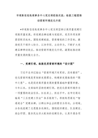 【七哥公文】2024年:市道路信息轨道事务中心党支部经验交流:绘就三幅图推动营商环境优化升级+更多免费公文+VX:QiGeGongWen2024