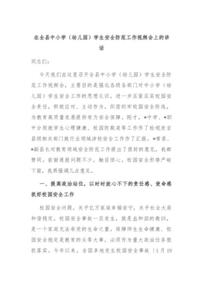 【七哥公文】2024年:在全县中小学(幼儿园)学生安全防范工作视频会上的讲话+更多免费公文+VX:QiGeGongWen2024