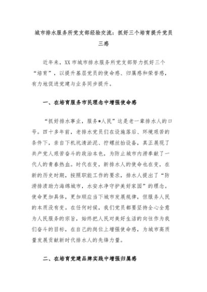 【七哥公文】2024年:城市排水服务所党支部经验交流:抓好三个培育提升党员三感+更多免费公文+VX:QiGeGongWen2024