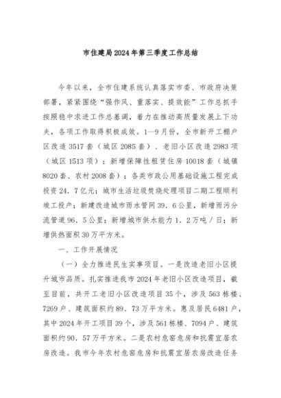 / 【七哥公文】2024年:市住建局2024年第三季度工作总结+更多免费公文+VX:QiGeGongWen2024