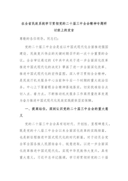 【七哥公文】2024年:在全省民政系统学习贯彻党的二十届三中全会精神专题研讨班上的发言+更多免费公文+VX:QiGeGongWen2024