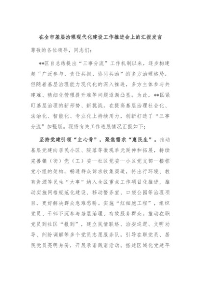 / 【七哥公文】2024年:在全市基层治理现代化建设工作推进会上的汇报发言+更多免费公文+VX:QiGeGongWen2024