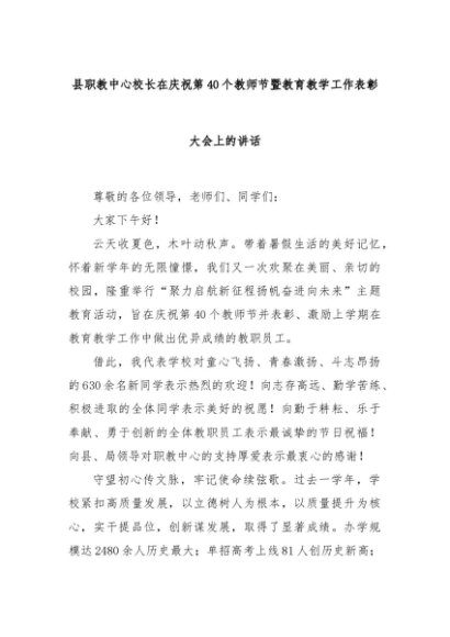 【七哥公文】2024年:县职教中心校长在庆祝第40个教师节暨教育教学工作表彰大会上的讲话+更多免费公文+VX:QiGeGongWen2024