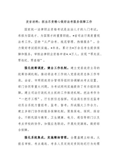 / 【七哥公文】2024年:发言材料:担当尽责精心做好法考服务保障工作+更多免费公文+VX:QiGeGongWen2024