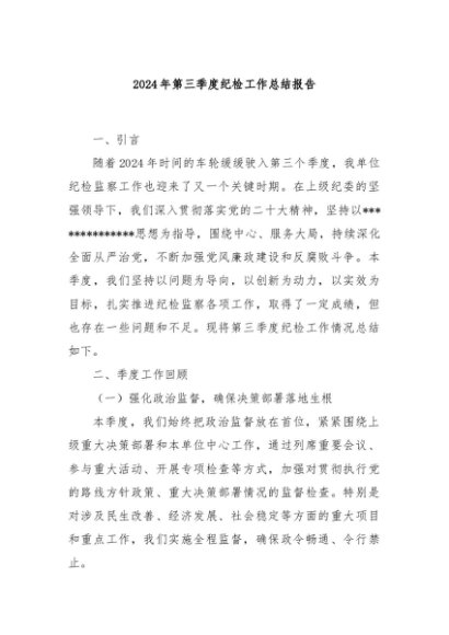 / 【七哥公文】2024年:2024年第三季度纪检工作总结报告+更多免费公文+VX:QiGeGongWen2024