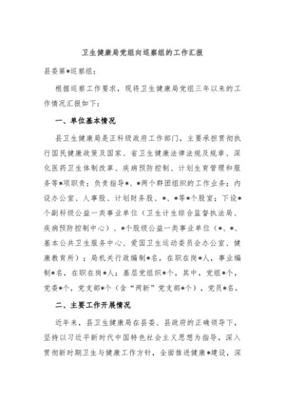 / 【七哥公文】2024年:卫生健康局党组向巡察组的工作汇报+更多免费公文+VX:QiGeGongWen2024