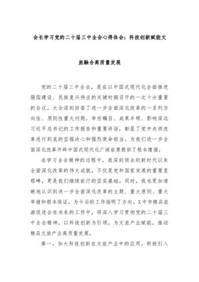 【七哥公文】2024年:会长学习党的二十届三中全会心得体会:科技创新赋能文旅融合高质量发展+更多免费公文+VX:QiGeGongWen2024