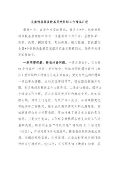/ 【七哥公文】2024年:县整顿软弱涣散基层党组织工作情况汇报+更多免费公文+VX:QiGeGongWen2024