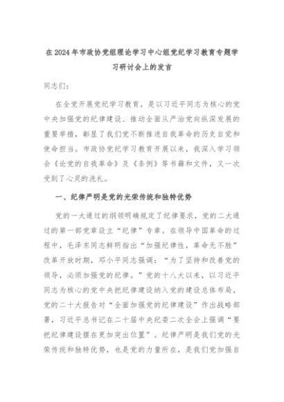 【七哥公文】2024年:在2024年市政协党组理论学习中心组党纪学习教育专题学习研讨会上的发言+更多免费公文+VX:QiGeGongWen2024