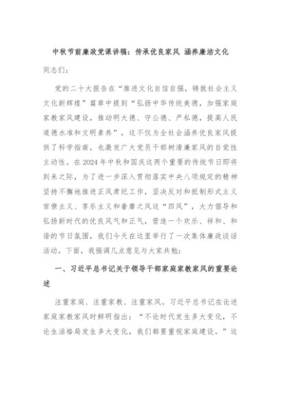 / 【七哥公文】2024年:中秋节前廉政党课讲稿:传承优良家风 涵养廉洁文化+更多免费公文+VX:QiGeGongWen2024