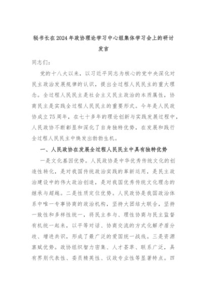【七哥公文】2024年:秘书长在2024年政协理论学习中心组集体学习会上的研讨发言+更多免费公文+VX:QiGeGongWen2024