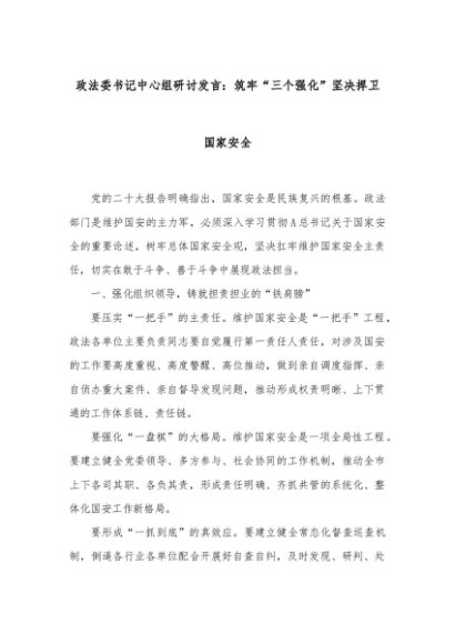 【七哥公文】2024年:政法委书记中心组研讨发言:筑牢“三个强化”坚决捍卫国家安全+更多免费公文+VX:QiGeGongWen2024