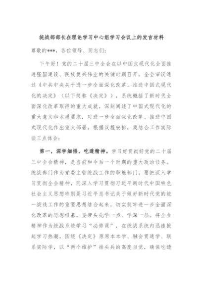 / 【七哥公文】2024年:统战部部长在理论学习中心组学习会议上的发言材料+更多免费公文+VX:QiGeGongWen2024