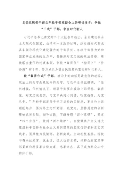 【七哥公文】2024年:县委组织部干部在年轻干部座谈会上的研讨发言:争做“三式”干部,争当时代新人+更多免费公文+VX:QiGeGongWen2024