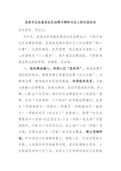 / 【七哥公文】2024年:县委书记在基层社区治理专题研讨会上的交流发言+更多免费公文+VX:QiGeGongWen2024