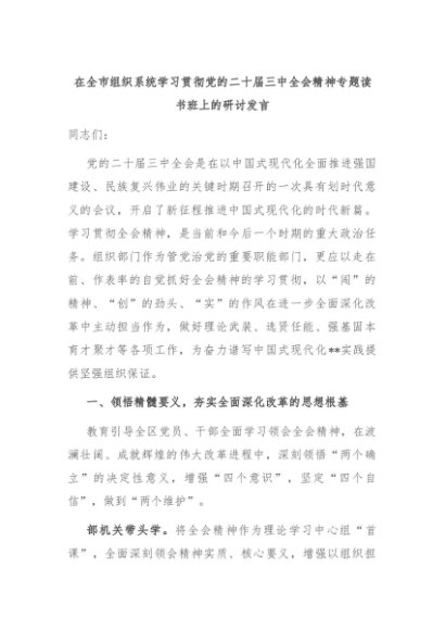【七哥公文】2024年:在全市组织系统学习贯彻党的二十届三中全会精神专题读书班上的研讨发言+更多免费公文+VX:QiGeGongWen2024
