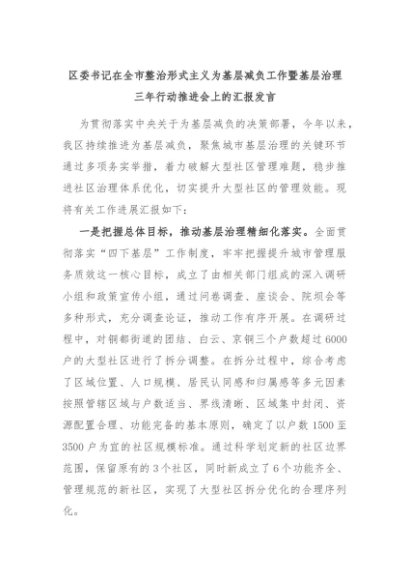 【七哥公文】2024年:区委书记在全市整治形式主义为基层减负工作暨基层治理三年行动推进会上的汇报发言+更多免费公文+VX:QiGeGongWen2024