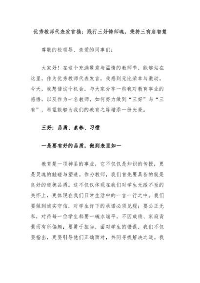 【七哥公文】2024年:优秀教师代表发言稿:践行三好铸师魂,秉持三有启智慧+更多免费公文+VX:QiGeGongWen2024