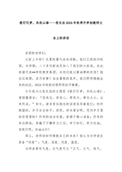【七哥公文】2024年:提灯引梦,共赴山海——校长在2024年秋季开学初教师大会上的讲话 (1)+更多免费公文+VX:QiGeGongWen2024