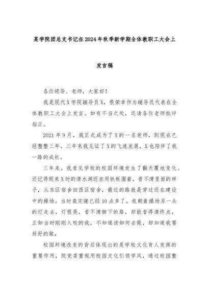 【七哥公文】2024年:某学院团总支书记在2024年秋季新学期全体教职工大会上发言稿+更多免费公文+VX:QiGeGongWen2024
