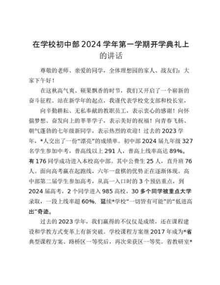 / 【七哥公文】2024年:在学校初中部2024学年第一学期开学典礼上的讲话+更多免费公文+VX:QiGeGongWen2024