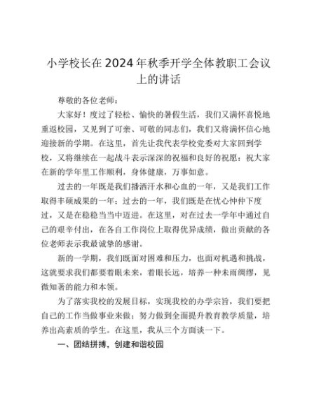 【七哥公文】2024年:小学校长在2024年秋季开学全体教职工会议上的讲话+更多免费公文+VX:QiGeGongWen2024
