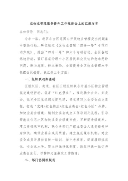 / 【七哥公文】2024年:在物业管理服务提升工作推进会上的汇报发言+更多免费公文+VX:QiGeGongWen2024