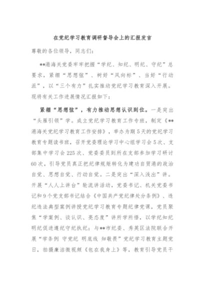 / 【七哥公文】2024年:在党纪学习教育调研督导会上的汇报发言+更多免费公文+VX:QiGeGongWen2024