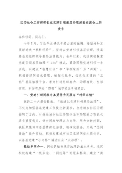 【七哥公文】2024年:区委社会工作部部长在党建引领基层治理经验交流会上的发言+更多免费公文+VX:QiGeGongWen2024
