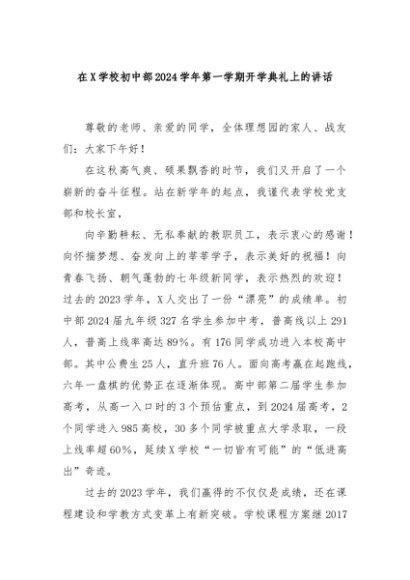 【七哥公文】2024年:在X学校初中部2024学年第一学期开学典礼上的讲话+更多免费公文+VX:QiGeGongWen2024
