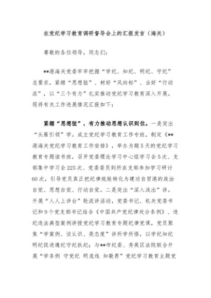 / 【七哥公文】2024年:在党纪学习教育调研督导会上的汇报发言(海关)+更多免费公文+VX:QiGeGongWen2024