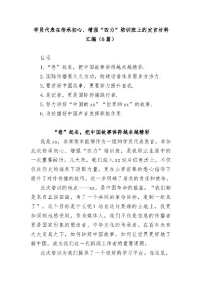【七哥公文】2024年:(6篇)学员代表在传承初心、增强“四力”培训班上的发言材料汇编+更多免费公文+VX:QiGeGongWen2024