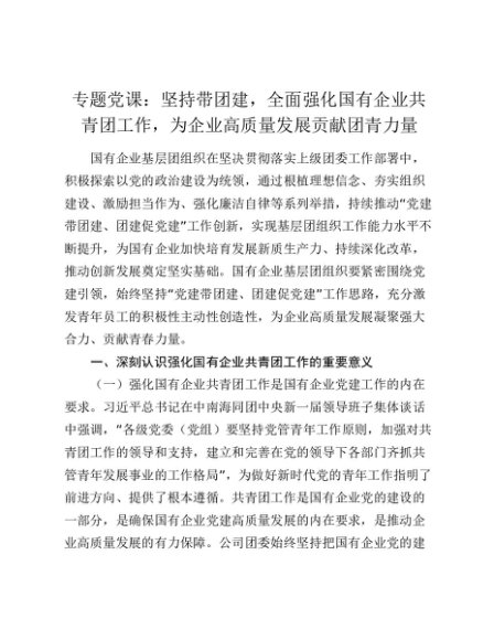 【七哥公文】2024年:专题党课:坚持带团建,全面强化国有企业共青团工作,为企业高质量发展贡献团青力量+更多免费公文+VX:QiGeGongWen2024