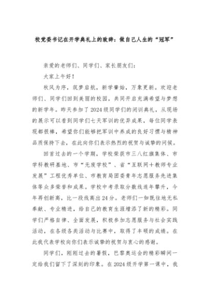 【七哥公文】2024年:校党委书记在开学典礼上的致辞:做自己人生的“冠军”+更多免费公文+VX:QiGeGongWen2024