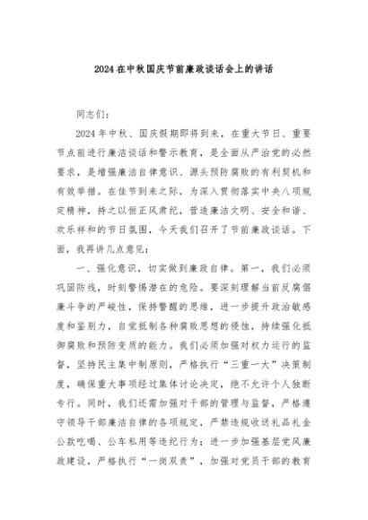 / 【七哥公文】2024年:2024在中秋国庆节前廉政谈话会上的讲话+更多免费公文+VX:QiGeGongWen2024
