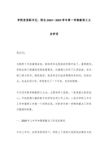 【七哥公文】2024年:学院党委副书记、院长2024-2025学年第一学期教职工大会讲话+更多免费公文+VX:QiGeGongWen2024