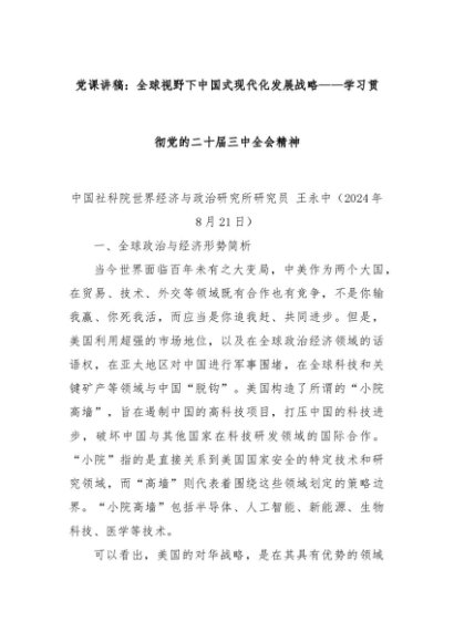 【七哥公文】2024年:党课讲稿:全球视野下中国式现代化发展战略——学习贯彻党的二十届三中全会精神+更多免费公文+VX:QiGeGongWen2024