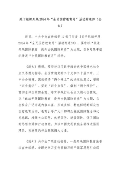 【七哥公文】2024年:关于组织开展2024年“全民国防教育月”活动的通知(全文)+更多免费公文+VX:QiGeGongWen2024