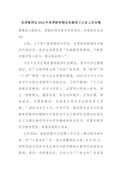 【七哥公文】2024年:优秀教师在2024年秋季新学期全体教职工大会上发言稿+更多免费公文+VX:QiGeGongWen2024