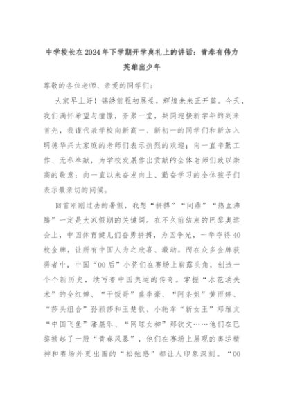 【七哥公文】2024年:中学校长在2024年下学期开学典礼上的讲话:青春有伟力英雄出少年+更多免费公文+VX:QiGeGongWen2024