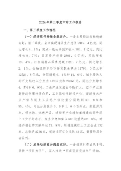 / 【七哥公文】2024年:2024年第三季度市府工作报告+更多免费公文+VX:QiGeGongWen2024