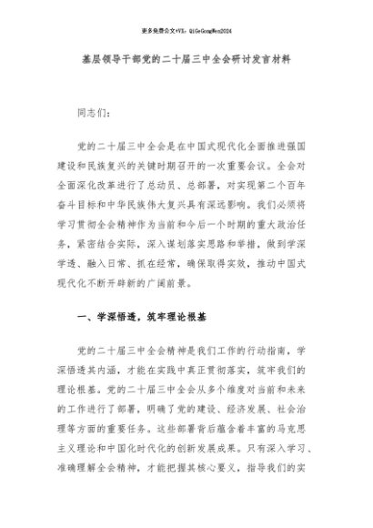 / 【七哥公文】2024年:基层领导干部党的二十届三中全会研讨发言材料+更多免费公文+VX:QiGeGongWen2024