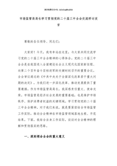 【七哥公文】2024年:市场监管局局长学习贯彻党的二十届三中全会交流研讨发言+更多免费公文+VX:QiGeGongWen2024